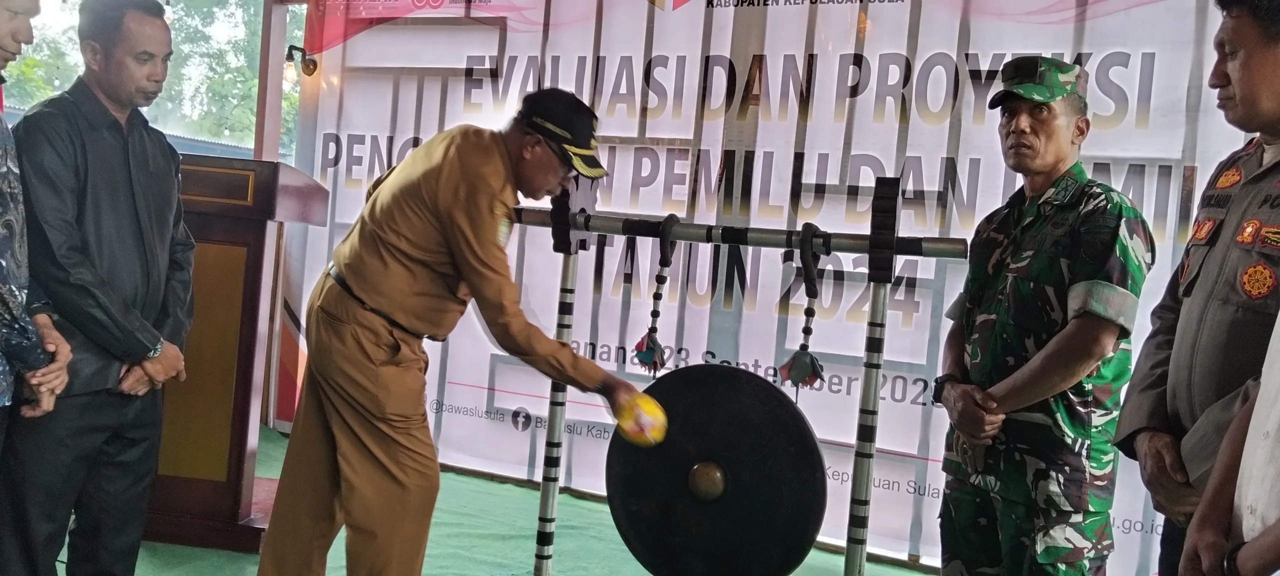 Wabup Sula M.Saleh Marasabessy memukul gong tanda kegiatan Evaluasi dan Proyeksi di Bawaslu Sula di Mulai