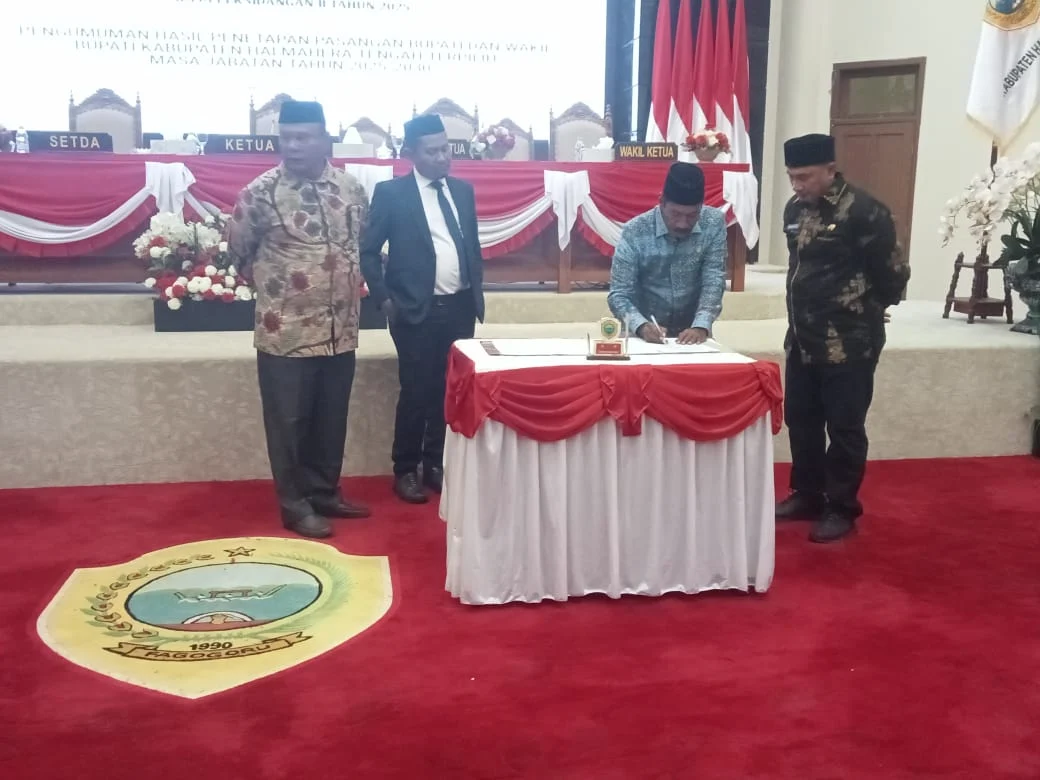 Ketua DPRD setelah membaca pengumuman hasil berdasarkan salinan keputusan KPU nomor : 5 tahun 2025 yang di tuangkan dalam berita acara KPU nomor : 16/PL.01.7-SL/8202/4/2025 tertanggal 7 Februari 2025 itu, langsung menandatangani berita acara paripurna pengumuman hasil pilkada halteng yang didampingi langsung dua wakil ketua dan pejabat Sekretaris Daerah.