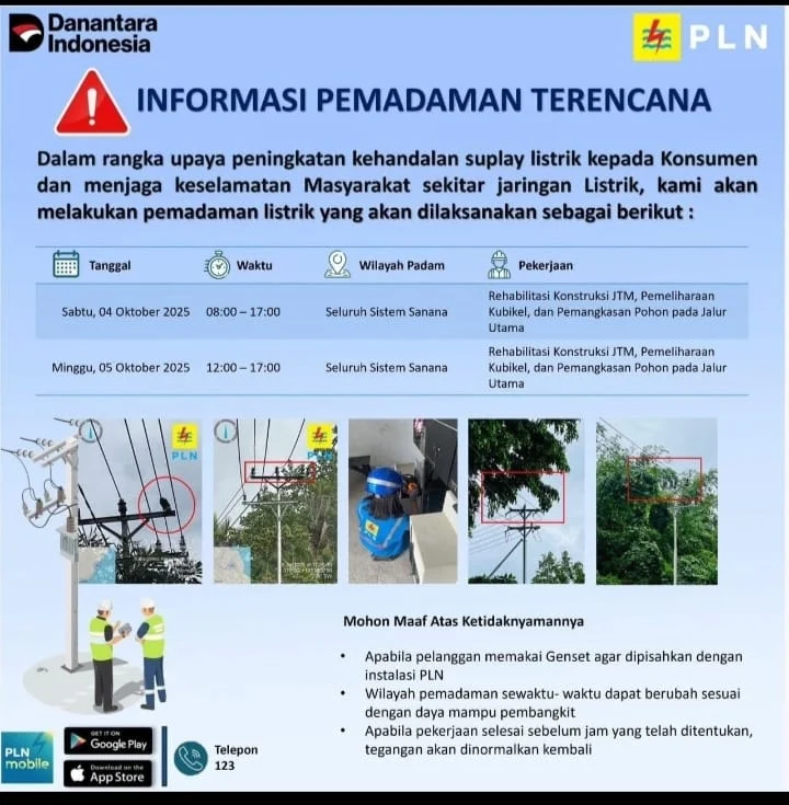 Ia menambahkan, perencanaan pemadaman ini akan dilakukan pada hari sabtu 4 Oktober 2025 dan dimulai pada pukul 08:00 – 17:00 WIT dan pada minggu 5 Oktober 2025 dari pukul 12:00 – 17:00 WIT.