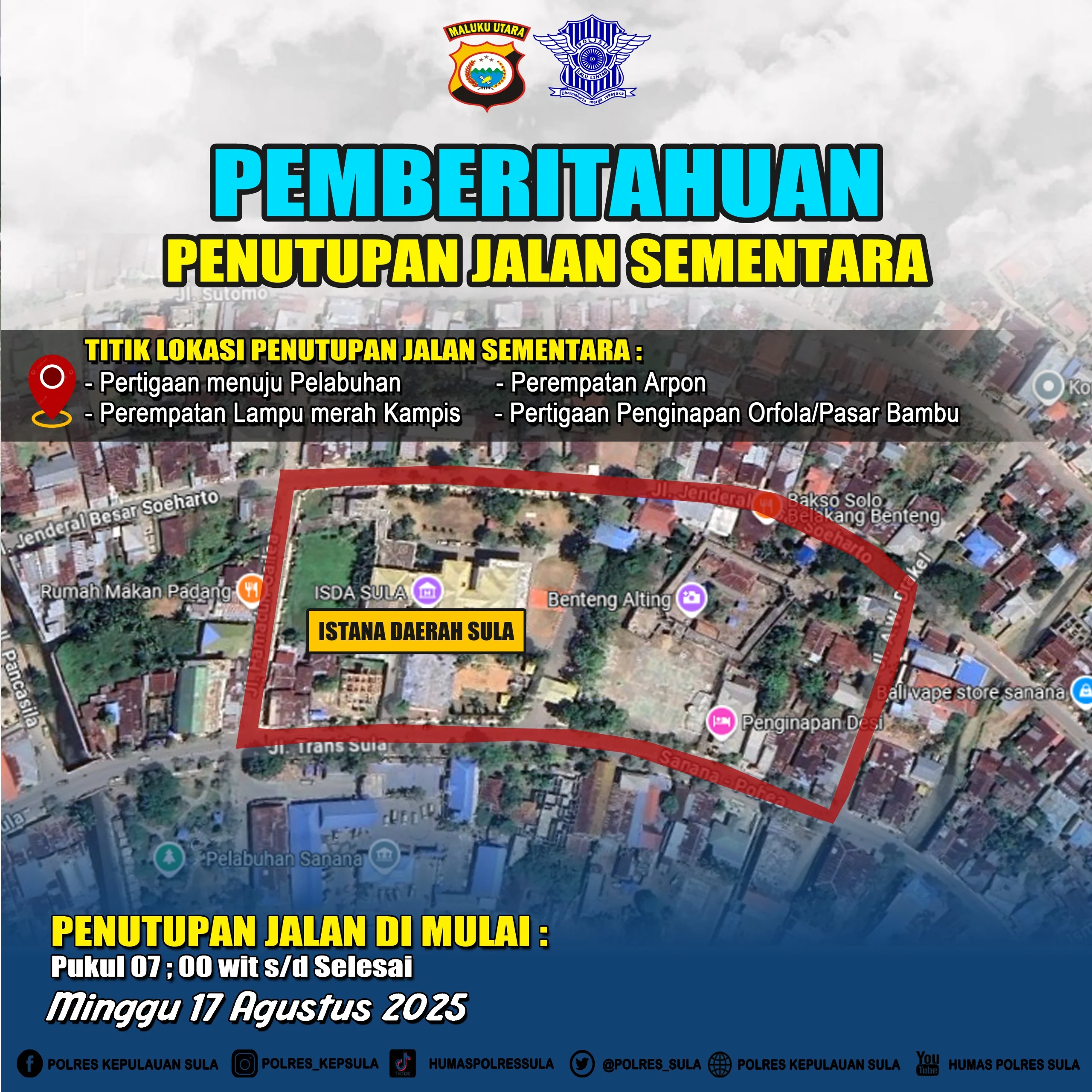 SANANA, DADIKANUSANTARA.COM- Satuan Lalulintas Polres Kepulauan Sula akan merekayasa lalulintas dengan menutup jalur lingkar istana daerah pada besok minggu, (17/8/2025).