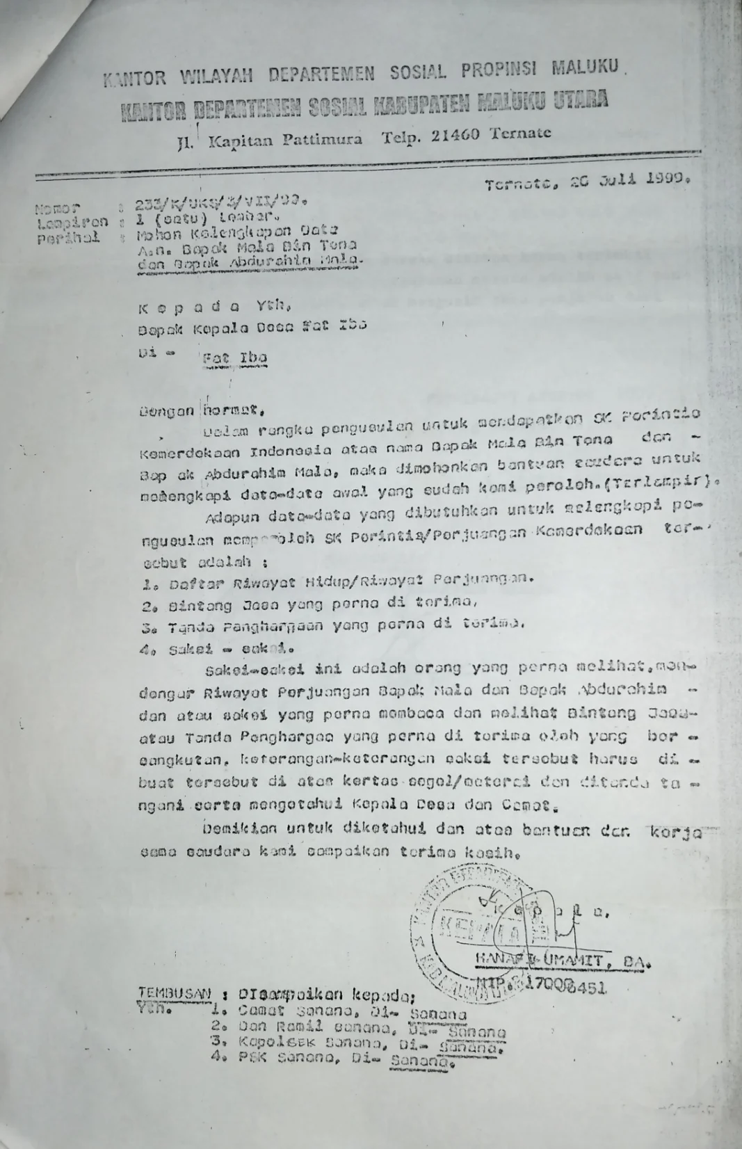 Pada tahun 1999, tiga putra Sula ini telah diusung oleh pemerintah kabupaten Maluku Utara melalui departemen sosial untuk memperoleh SK Perintis Kemerdekaan dari Negara pada 17 Agustus 1999, namun karena kepala Departemen Sosial bapak Hanafi Umamit lebih dulu meninggal sebelum berkasnya rampung, akhirnya sampai saat ini 3 nama tersebut hilang dalam catatan sejarah. Padahal mereka adalah bagian dari orang-orang yang memperjuangkan kemerdekaan dengan legalitas yang dapat dipercaya, bahkan pernah menjalani siksa berat oleh kejamnya Perintah kolonial Belanda selama di tawan dalam penjara. (*)