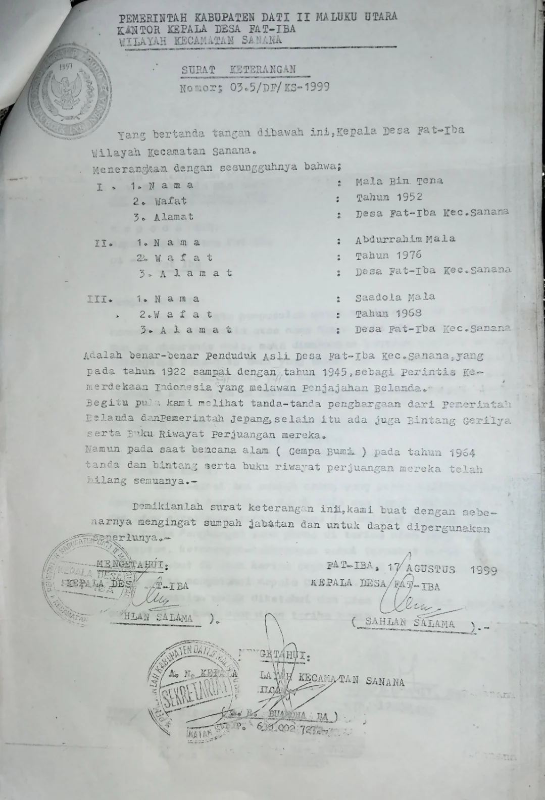 Surat keterangan kepala desa Fat Iba tahun 1999 tentang tiga warganya